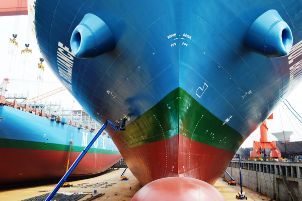 圖為企業(yè)職工正在為出塢前的大船完善吃水線等標(biāo)識