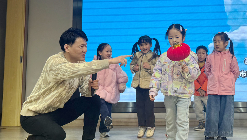 非遺傳承人——胡盛,走進文江園,他用故事串聯(lián)泰興花鼓的歷史脈絡(luò),講述了泰興花鼓的起源、發(fā)展以及表演技巧,并現(xiàn)場示范、教授“顛三步”“喜鵲登梅步”“四方步”等經(jīng)典步伐。孩子們看得目不轉(zhuǎn)睛,躍躍欲試。胡盛老師耐心地蹲下身子,手把手指導(dǎo)孩子們調(diào)整姿勢。漸漸地,孩子們的動作從笨拙到流暢,會場里洋溢著歡聲笑語。