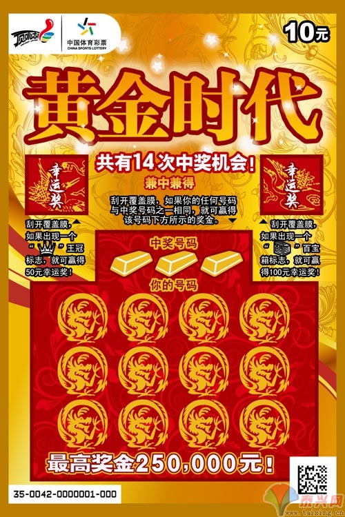 從金燦燦的票面來看,“黃金時代”可以說是頂呱刮經(jīng)典的珠光寶氣系列票種的延續(xù),10元的面值,最高25萬元的獎金這些關(guān)鍵詞都是彩民再熟悉不過的了。從“三重鉆石”、“百寶箱”再到如今的“黃金時代”,頂呱刮的珠寶旋風(fēng)仍將逾加強(qiáng)勁。 “黃金時代”共有3個刮開區(qū),最大的刮開區(qū)延續(xù)了10元票的經(jīng)典數(shù)字匹配玩法,可有12次中獎機(jī)會,刮開覆蓋膜,如果你的任何號碼與中獎號碼之一相同,就可贏得該號碼下方所示的獎金;而另外兩個刮開區(qū)則是該票的幸運(yùn)獎區(qū),刮開覆蓋膜,如果出現(xiàn)王冠或百寶箱標(biāo)志,就可贏得相應(yīng)的幸運(yùn)獎金。如果算上全部三個刮開區(qū),“黃金時代”共有14次中獎機(jī)會,這顯然也是10元票種的一個全新升級,相信會帶給彩民格外的驚喜體驗(yàn)。 支援災(zāi)區(qū)“大愛無疆”