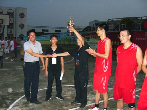 市體育局領導為冠軍隊頒獎 本次籃球邀請賽于7月31日開賽,由市天華印刷、萬通房產公司、泰州市科泰巖土工程有限公司、1+1樓梯泰興銷售處等4個單位主辦,市特殊教育學校、凱興網絡中心協辦,來自我市企事業單位部分籃球愛好者組成的“星期天假日”隊共6支代表隊100余名隊員參賽。賽制采用分組循環賽和淘汰賽,歷時20多天,共打了10場比賽。