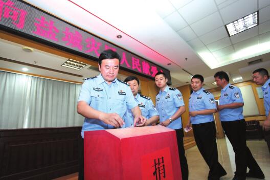 6月27日上午,市公安局900多名民警自發向鹽城風災地區的人民捐款。僅一個上午,捐款就達10多萬元。