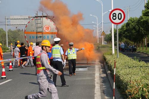 為深刻吸取江蘇德橋倉儲有限公司“4·22”火災(zāi)事故教訓,著力解決危險化學品道路運輸安全工作中存在的突出問題,堅決防止發(fā)生重特大道路交通事故,切實保障人民群眾生命財產(chǎn)安全,7月21日,泰興公安交警大隊在泰興市悅達危險品運輸有限公司開展了由虹橋鎮(zhèn)綜治辦、中丹集團消防隊以及轄區(qū)新昌、泰華、太平洋危險品公司等多部門聯(lián)合舉辦的危化品道路運輸泄漏事故應(yīng)急救援演練。此次演練的內(nèi)容設(shè)定為在S232省道,悅達危險品公司一輛滿載有危險化學品的槽罐車從專用停車場出發(fā),行駛至S232-28km處被另一輛肇事貨車追尾,導致危險品槽罐車閥門受損,引發(fā)危險品泄漏的事故。事故發(fā)生后,虹橋交警中隊調(diào)動警力迅速對現(xiàn)場交通進行管制,同時立即向上級部門領(lǐng)導匯報,啟動應(yīng)急聯(lián)動機制,調(diào)集相關(guān)聯(lián)動單位到場配合。消防處置力量到場后,按照泄漏事故處置要點通過偵查檢測、警戒疏散、生命救助和稀釋驅(qū)散等戰(zhàn)斗環(huán)節(jié),在參戰(zhàn)聯(lián)動單位積極配合下,經(jīng)過一個小時戰(zhàn)斗成功處置險情。