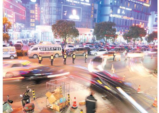 1月25日,農(nóng)歷臘月二十八晚8時(shí)許,為保證道路通暢,市公安局交警大隊(duì)新區(qū)中隊(duì)的女警們?cè)谖沂蟹比A路段,用自己的身體將車流隔開進(jìn)行分流,站成一排的民警尤如車流中一堵流動(dòng)的“分隔欄”。通訊員 黃新麗 陸裕順 攝