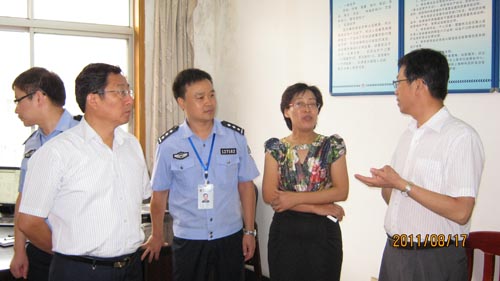 8月17日上午,泰州市人民檢察院檢察長周劍浩一行在市委政法委書記田之本的陪同下,到市公安局鼓樓派出所調研檢察官駐派出所工作情況,認真了解駐所檢察官們的日常工作,并要求駐所檢察官們要走進基層、服務群眾。(袁園 李娟)