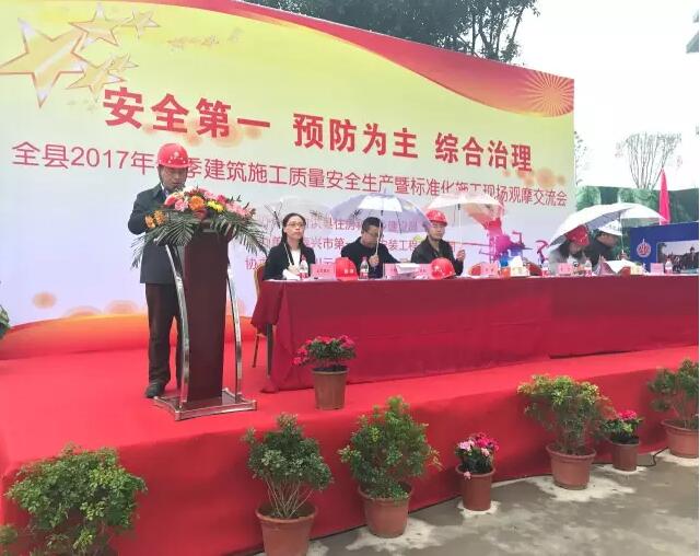 3月29日,由射洪縣住房和城鄉(xiāng)建設(shè)局主辦、泰興市第一建筑安裝工程有限公司承辦、四川云辰置業(yè)有限公司協(xié)辦的射洪縣“全縣2017年春季建筑施工質(zhì)量安全生產(chǎn)工作暨標(biāo)準(zhǔn)化施工現(xiàn)場(chǎng)觀(guān)摩交流會(huì)”在河?xùn)|經(jīng)開(kāi)區(qū)云辰國(guó)際項(xiàng)目地順利召開(kāi)。 射洪縣住建局黨委書(shū)記、局長(zhǎng)黃偉,縣住建局黨委委員、副局長(zhǎng)陳鋼,縣建設(shè)工程質(zhì)量安全監(jiān)督站站長(zhǎng)衡順,縣住建局監(jiān)察執(zhí)法大隊(duì)隊(duì)長(zhǎng)倪長(zhǎng)生,縣住建局村鎮(zhèn)股股長(zhǎng)楊利銳,泰興一建公司西南分公司總經(jīng)理印輝,四川云辰置業(yè)有限公司總經(jīng)理張怡及全縣五大國(guó)有平臺(tái)公司、15家建筑總承包企業(yè)、7家監(jiān)理企業(yè)、52個(gè)在建項(xiàng)目、部分易地扶貧搬遷建設(shè)代表參加了此次觀(guān)摩交流會(huì)。