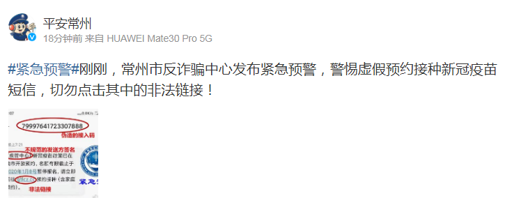 最近,新冠疫苗成了大家關(guān)注的熱點(diǎn)話題。 但也有一些不法分子借此發(fā)揮, 蹭“新冠疫苗”熱度進(jìn)行詐騙。 剛剛,常州市反詐騙中心發(fā)布緊急預(yù)警, 警惕虛假預(yù)約接種新冠疫苗短信, 切勿點(diǎn)擊其中的非法鏈接!