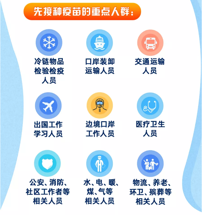 現(xiàn)在接種的對(duì)象有特定的人群,也就是重點(diǎn)對(duì)象。重點(diǎn)對(duì)象主要包括,第一個(gè)是接觸進(jìn)口冷鏈?zhǔn)称返膹臉I(yè)人員,包括生產(chǎn)、銷售、運(yùn)輸以及流通的人群;第二個(gè)是出國(guó)、留學(xué)、培訓(xùn)或者務(wù)工的人員;第三,海關(guān)、檢疫口岸的邊防人員;第四,醫(yī)務(wù)人員;第五,交通運(yùn)輸?shù)谋U先藛T等等。