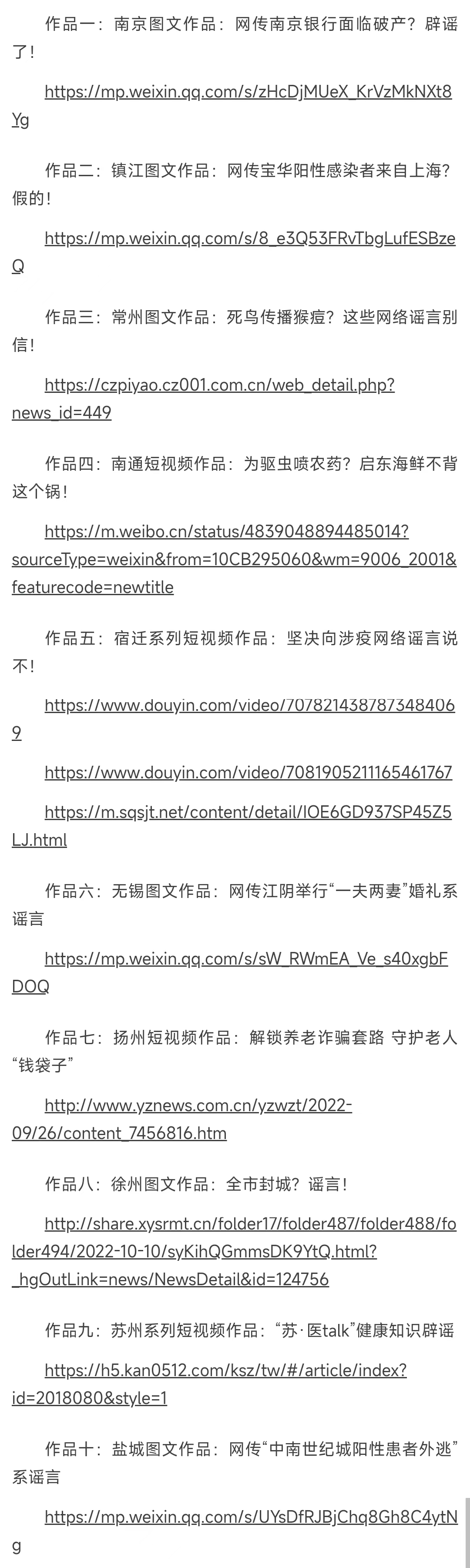 為宣傳展示2022年度全省網(wǎng)絡辟謠工作成效,調動社會各方力量參與網(wǎng)絡辟謠工作的積極性和主動性,提高社會公眾識謠辨謠能力和媒介素養(yǎng),推動形成全社會共同抵制、共同治理網(wǎng)絡謠言的良好氛圍,江蘇省委網(wǎng)信辦近期組織開展了2022年度“全省網(wǎng)絡辟謠優(yōu)秀作品”征集評選活動,現(xiàn)將評選結果予以公布: