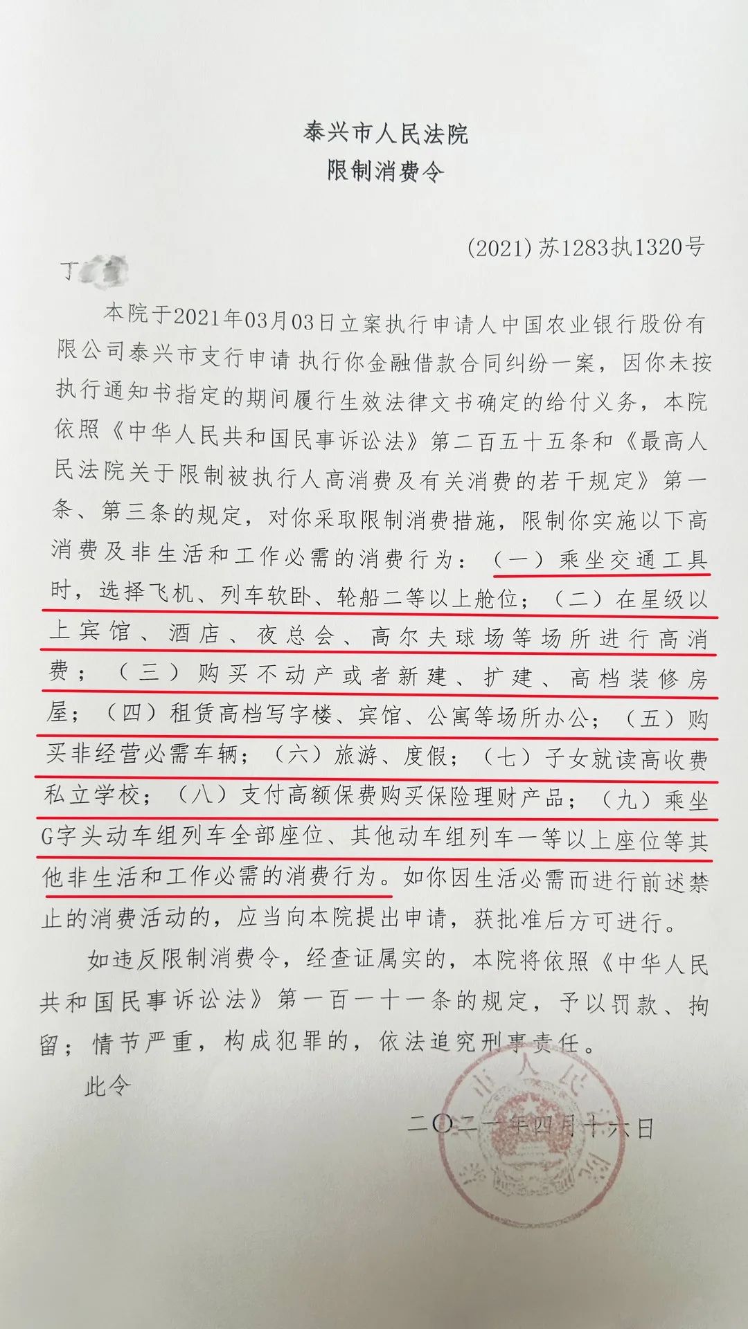 基本案情 泰興法院在執(zhí)行申請執(zhí)行人中國農(nóng)業(yè)銀行股份有限公司泰興市支公司與被執(zhí)行人丁某金融借款糾紛一案中,因被執(zhí)行人丁某未按執(zhí)行通知書指定的期間履行生效法律文書確定的給付義務(wù),法院于2021年4月16日對被執(zhí)行人丁某發(fā)出限制消費令。