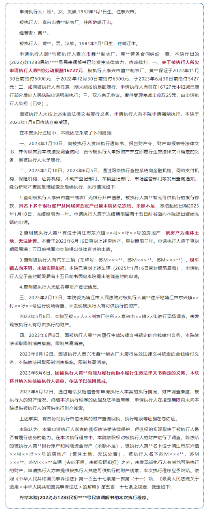 【曝光失信案例】泰興一制衣廠老板被納入失信被執(zhí)行人名單