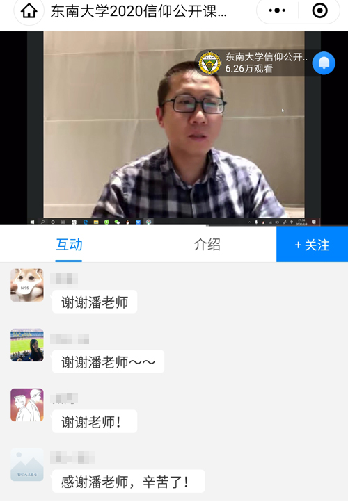 龍虎網(wǎng)訊(通訊員 葉菁)把課堂開進武漢金銀潭醫(yī)院,現(xiàn)場與大學生互動;把疫情防控工作中的所見所聞、所行所為、所思所想與大學生們分享……超6萬人在線聽講,近5千多條評論,自3月5日開課至今,東南大學“信仰公開課——戰(zhàn)‘疫’云講演”已成為東南大學師生每晚期待的必修課。 直擊湖北 連線中大醫(yī)院重癥醫(yī)學航母戰(zhàn)隊 “這就是武漢金銀潭醫(yī)院的重癥ICU病房,在這里大家可以看到醫(yī)護人員們在對新冠肺炎疫情患者進行細心的治療和照顧……”3月8日晚上,新冠肺炎國家衛(wèi)健委專家組成員、國家醫(yī)療救援隊隊員、東南大學附屬中大醫(yī)院重癥醫(yī)學科副主任潘純在東南大學“信仰公開課——戰(zhàn)‘疫’云講演”的直播間中,帶領東南大學的師生們走近戰(zhàn)“疫”紅區(qū)ICU,分享那些同死神“搶人”的經(jīng)歷。看到潘純出現(xiàn)在直播間中,評論區(qū)都沸騰了,同學們紛紛抓住機會詢問潘純醫(yī)生,“現(xiàn)在病人的情況怎么樣了?”“去一線時您害怕嗎?”“您和您的團隊是怎么快速適應的?生活怎么樣?”潘純醫(yī)生耐心細致的一一解答,他坦言一點不害怕是不可能的,但他堅信有科學的防控技能和豐富的臨床經(jīng)驗,每個人都不忘救死扶傷的初心使命,也正是如此,可以戰(zhàn)勝一個個困難,而病人對他們的信任更是支持他前進的動力。