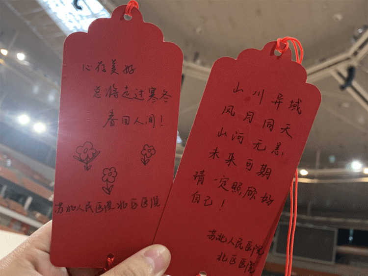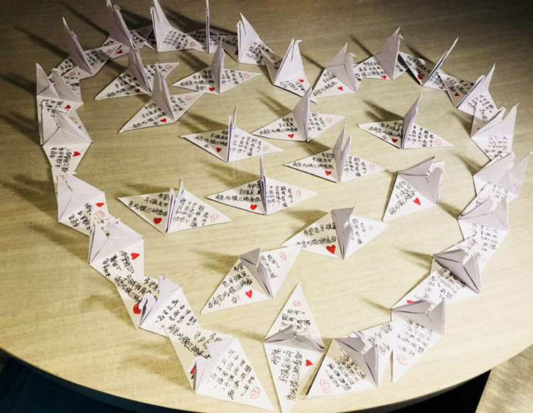 世界這么大,難得遇到你 為了拉近與艙內(nèi)患者們的距離,讓患者能保持心情愉悅,醫(yī)務(wù)人員使出了“十八般武藝”: 有的醫(yī)務(wù)人員利用休息時間折了很多千紙鶴送給患者,每一只千紙鶴上寫著對患者的祝福:“期待您早日康復(fù)”,“武漢加油,中國加油”,“堅定信心,期待春暖花開。”