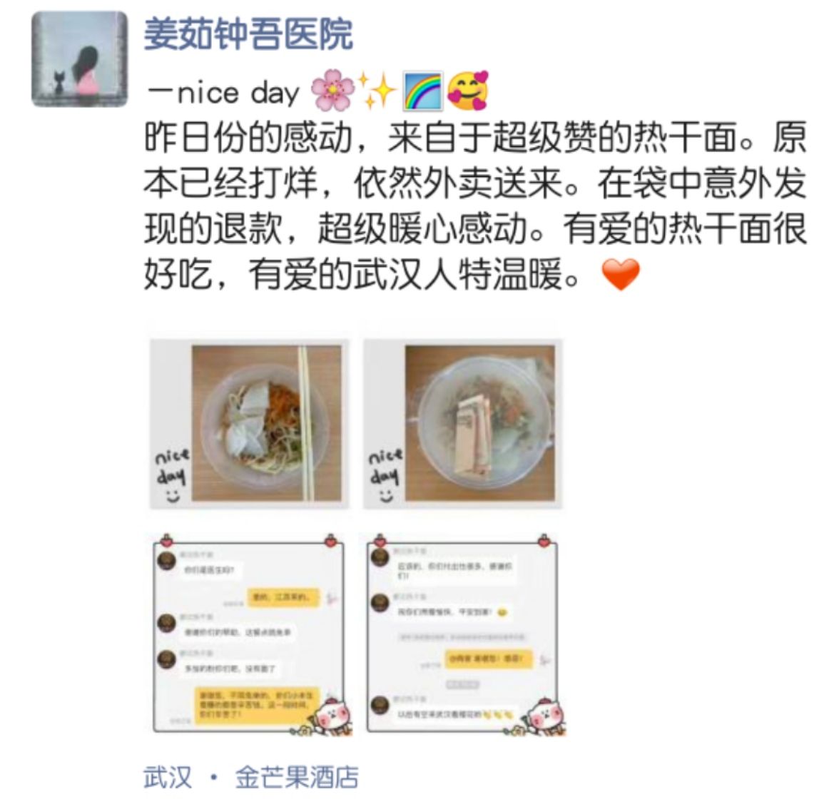 姜茹發(fā)的微信朋友圈 “那天大家商量,晚上吃熱干面,當?shù)氐尼t(yī)生為我們推薦了一家面館。下單后,我忘記提交了。下午4點左右,再準備付款時,發(fā)現(xiàn)已經(jīng)打烊了。”3月23日上午,宿遷市鐘吾醫(yī)院醫(yī)務人員姜茹說,武漢的外賣剛剛恢復營業(yè)不久,她想著有的商家會因為訂單多忙不過來,店鋪會開一會兒關一會兒。姜茹抱著試試看的心理,撥打了這家面館的電話。 “請問一下,今天還有熱干面嗎?” “如果您想吃的話,明天9點再訂哦!你們是醫(yī)生嗎?” “是的,江蘇來的!” “謝謝你們的幫助!面不多,還有粉!”