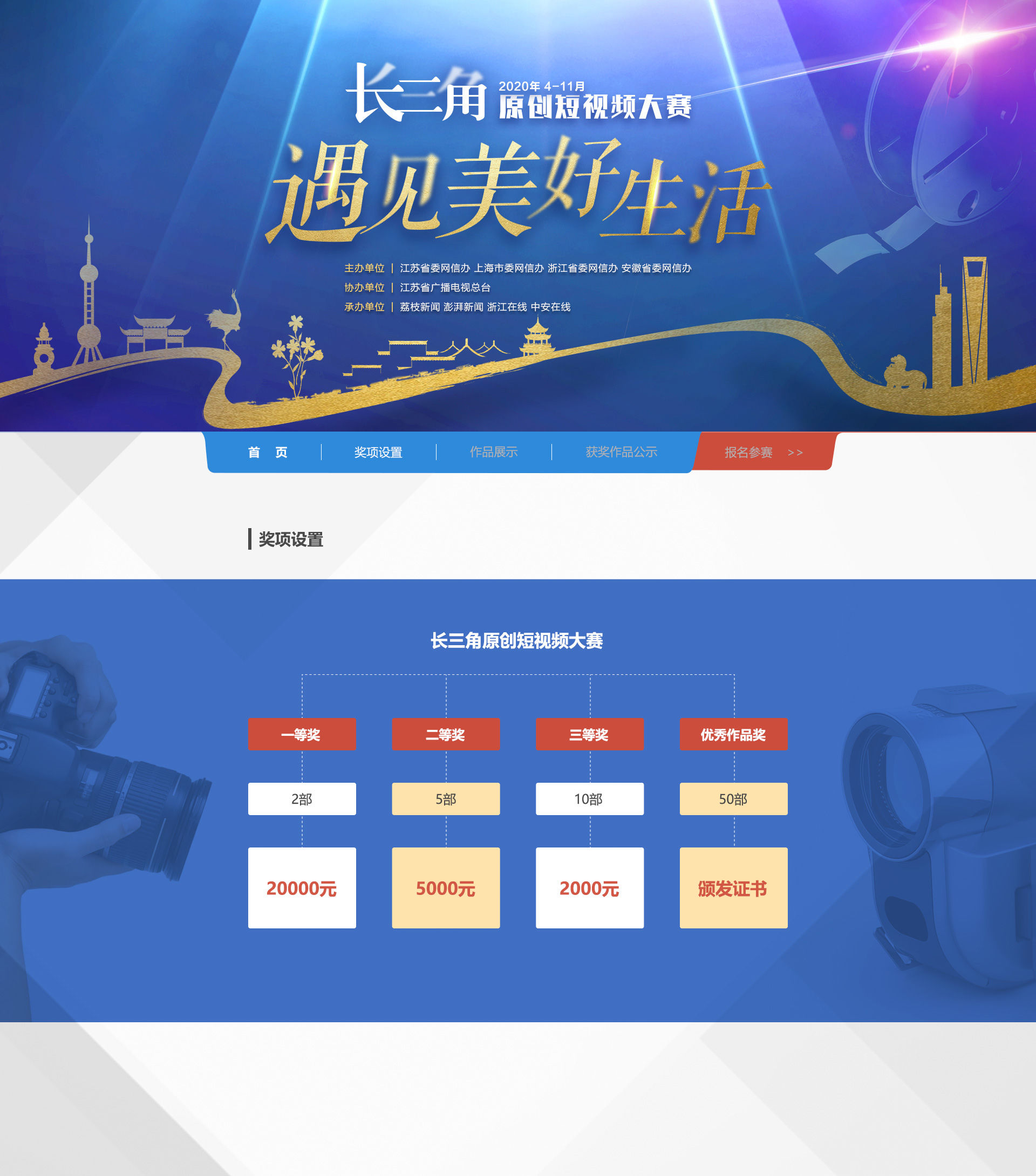 獎項設立豐富且權威!機會屬于你! 參賽方式包容并蓄,不拘一格邀佳作!大賽設立“遇見美好生活”——主單元,與“小康”模樣——特別單元,橫(屏)豎(屏)皆可,甜咸不忌。關于我們所處的這個美好時代、身邊的美好生活,發現、記錄或是講述,敬請點燃你的創作小宇宙,不吝賜教。 劃重點!關于本次大賽你需要知道的一切—— 【Q:“遇見美好生活”長三角原創短視頻大賽是什么?】 這是一個集權威性、含金量、影響力于一身的專業性大獎賽!它將以解讀、詮釋全面小康的深刻內涵為主題,面向長三角乃至全國視頻愛好者和網友發出創作邀約。 【Q:誰可以參賽?】 熱愛短片創作的任何個人和集體。 【Q:大賽主題是什么?】 “民亦勞止,汔可小康。”綺麗愿景穿越千年,在我們身處的這個時代,照進現實。今年的大賽主題是“遇見美好生活”,旨在透過不同創作主體的多方視角,鼓勵綜合運用多種視頻表現手法和呈現方式,點贊長三角地區小康社會建設取得的豐碩成果,聚焦人民幸福安康的美好生活。 【Q:參賽作品分幾類?】 1、主單元——“遇見美好生活” (1)微電影 (2)微紀錄片 (3)公益短片 (4)動畫短片 2、特別單元——“小康”模樣 【Q:參賽作品要求?】 1、內容題材要求 主單元——“遇見美好生活”:透過城鄉建設、行業發展、家庭變遷、個人成長等不同維度,聚焦長三角地區全面小康的生動實踐,用光影描繪美好生活。題材不限,形式不限。 特別單元——“小康”模樣:以“微訪談”、隨手拍的形式,展現不同群體心中的“小康”模樣。視頻需為豎屏形態。 參賽作品必須符合國家法律、法規和版權有關規定,無色情、暴力、血腥等不良內容。要求題材好、創意新,契合主題、情節完整。 2、時長要求 所有作品時長只需3分鐘 無論是報送主單元或是特別單元,都不要超過3分鐘哦。 3、格式要求 參賽作品以mp4為主,avi、flv、mpg、wmv為備選格式。特別單元參賽作品需為豎屏短視頻。 4、上傳要求 參賽作品大小控制在300M以內,如超過建議壓縮后上傳。 5、版權要求 參賽作品必須由參賽者本人(或單位)原創,嚴禁剽竊、抄襲,參賽者應擁有作品的著作權。主辦方對全部參賽作品具有免費使用權。主辦單位不承擔包括(但不限于)肖像權、名譽權、隱私權、著作權、商標權等糾紛而產生的法律責任,如出現上述糾紛,主辦方保留取消其參賽資格及追回獎項的權利。 6、創作時限 參賽作品必須是網絡首發,并且是2020年1月1日起創作的短片。 【Q:獎項設置】