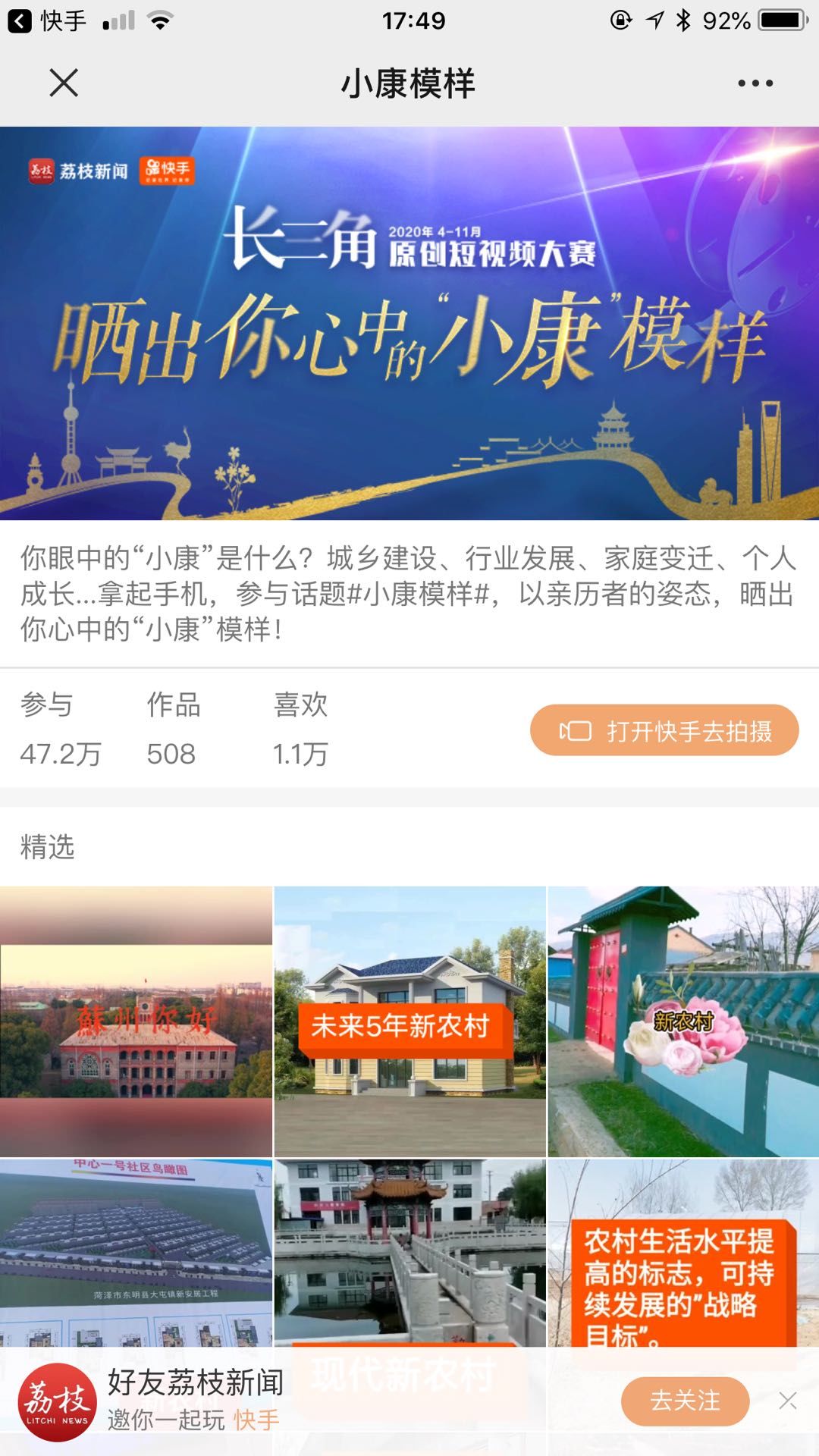 “小康”是什么? 是勞有所得,是住有所居,是幼有所教,是老有所養,是病有所醫……“小康”是踏踏實實的安全感,是滿滿當當的獲得感,是真真切切的幸福感。 一路走來,“小康”經過了數代人的努力,也為數代人所見證。從奔小康,到初步實現小康,再到決勝全面小康,人們對于美好生活的向往,正一一兌現。“小康”就是我們此刻正在經歷的美好生活。 走過改革開放的40年,新中國成立的70年,步履不停,我們迎來決勝全面小康的2020。值此之際,“遇見美好生活”長三角原創短視頻大賽即將開賽!邀你一起開啟創作模式,用光影“作畫”,記錄屬于“全面小康時代”的“美好style”。 本屆大賽由江蘇省委網信辦、上海市委網信辦、浙江省委網信辦、安徽省委網信辦主辦,荔枝新聞、澎湃新聞、浙江在線、中安在線承辦。