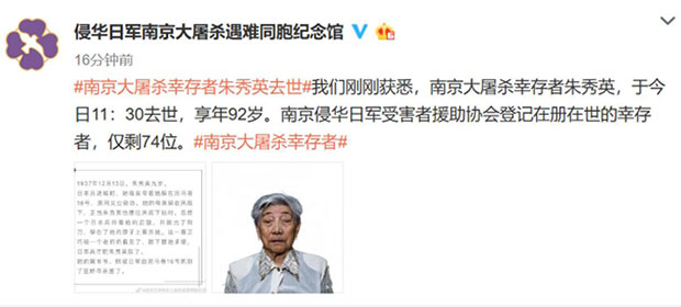南京大屠殺幸存者朱秀英去世 登記在世幸存者僅剩74位