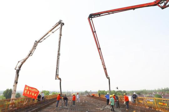 5月1日下午,經過近30個小時的連續施工,江蘇南沿江城際鐵路跨304縣道連續梁兩側B節段順利完成混凝土施工,在全線率先完成合龍目標,為后續架梁作業奠定了基礎。