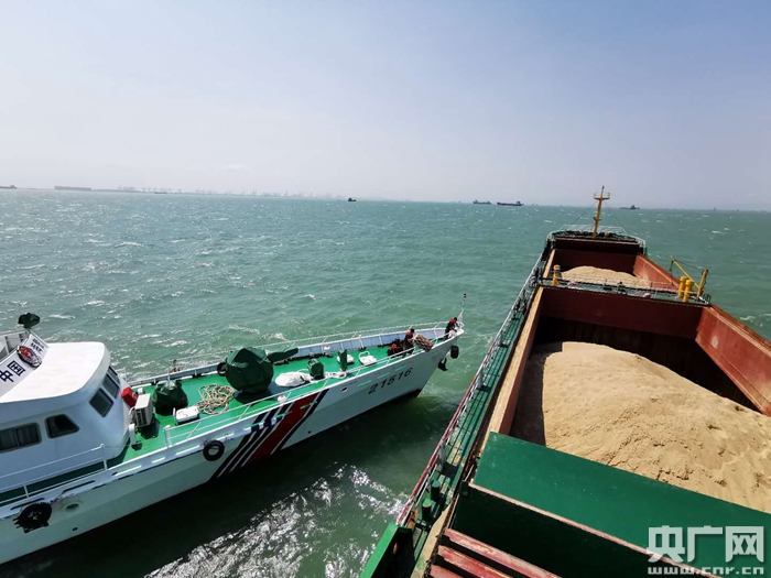 廣東海警艦艇檢查嫌疑船舶(央廣網發 廣東海警局供圖) “五一”假期首日,廣州海警局在珠三角海域查獲1起非法盜采海砂案件,現場查扣無合法手續海砂約2.1萬噸。 5月4日18時許,珠海海警局接95110轉警稱:從澳門機場東海域至斗門大橋水域,有多艘形跡可疑的船舶出沒。珠海海警局精準出擊,迅速派遣執法艇前往目標海域進行查緝。 歷經9個多小時的搜索,成功鎖定多艘正在非法作業的嫌疑船舶。經登臨檢查,海警執法員發現船上人員無法提供涉案所載海砂的合法手續,執法人員依法將該6艘嫌疑船舶進行查扣,現場查獲涉嫌盜采海砂約4萬余噸,抓獲涉案人員75名。