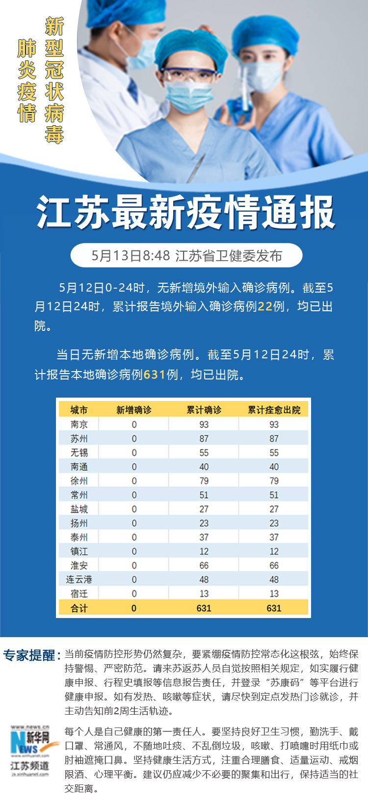 5月12日0-24時,無新增境外輸入確診病例。截至5月12日24時,累計報告境外輸入確診病例22例,均已出院。 當日無新增本地確診病例。截至5月12日24時,累計報告本地確診病例631例,均已出院。 當日無新增無癥狀感染者,解除集中隔離和醫學管理1人,尚在定點醫院集中隔離和醫學管理的無癥狀感染者1例,為境外輸入。 目前,追蹤到確診病例和無癥狀感染者的密切接觸者13637人,均已解除醫學觀察。 專家提醒:當前疫情防控形勢仍然復雜,要緊繃疫情防控常態化這根弦,始終保持警惕、嚴密防范。請來蘇返蘇人員自覺按照相關規定,如實履行健康申報、行程史填報等信息報告責任,并登錄“蘇康碼”等平臺進行健康申報。如有發熱、咳嗽等癥狀,請盡快到定點發熱門診就診,并主動告知前2周生活軌跡。 每個人是自己健康的第一責任人。要堅持良好衛生習慣,勤洗手、戴口罩、常通風,不隨地吐痰、不亂倒垃圾,咳嗽、打噴嚏時用紙巾或肘袖遮掩口鼻。堅持健康生活方式,注重合理膳食、適量運動、戒煙限酒、心理平衡。建議仍應減少不必要的聚集和出行,保持適當的社交距離。