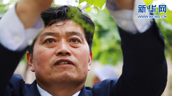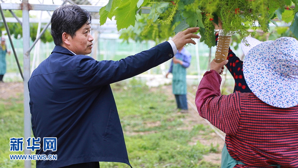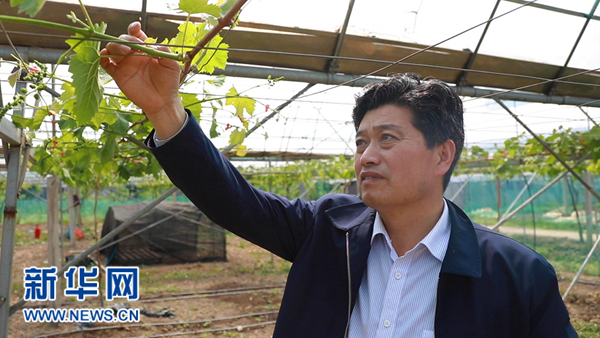 聶永平觀察葡萄的生長情況(唐楊 攝) “老書記培養我入黨,還希望我成為一名優秀的共產黨員。那么,我作為一名黨員,要服從組織的安排。我義無反顧地放棄了自己的生意,回到家鄉,擔當起先鋒村支部書記。”聶永平說,自己的主要任務是擺脫先鋒村貧困的面貌,帶領農民致富,這是他的理想和愿望。 從一個生意人到村支書,從最初的村民不信任到后來的愛戴擁護,這是聶永平一步一個腳印踏踏實實干出來的。最初連個辦公桌都沒有,他就將自己的辦公室直接挪至田間地頭;不知道種什么能致富,他就自己跑到鎮里的農科院從頭學起高效農業種植技術;帶領村民發展高效農業缺錢少人,他就自己到銀行做擔保人,并多次前往農技專家趙亞夫先生的家里求教。 “我們先鋒村在沒有工業基礎的情況下,應該因地制宜發展我們的經濟。我們最大的優勢就是土地,我們要通過土地來增加我們村級集體經濟收入,帶領農民致富。”聶永平說,“趙亞夫同志指導我們,應該按照先鋒村事業發展的規劃,‘旅游+農業’,所以我們種上了高架式基質栽培草莓,獲得了成功。”