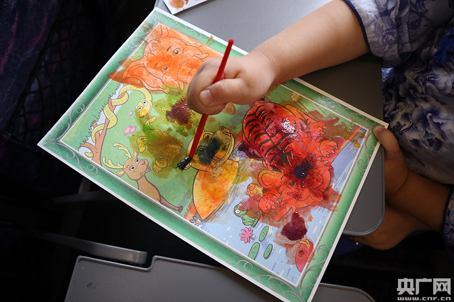 小旅客領到自己的“六一”小禮物:填色板(央廣網發 通訊員鐘潔 攝)