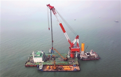 中交一航局江蘇啟東海上風電項目首樁沉樁作業現場。 陳 斌 苗曉煒攝 江蘇華威啟東海上風電場項目H1標、H2標近日完成首樁沉樁作業,標志著國內目前單體容量最大的海上風電項目主體工程開工建設。