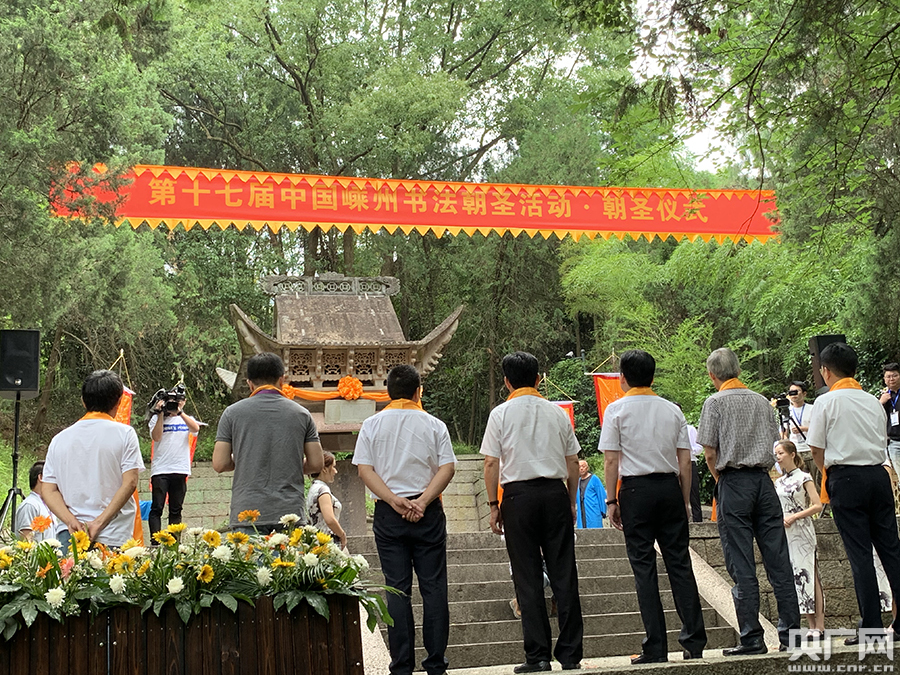 朝圣儀式(央廣網記者 張國亮 攝) 央廣網紹興6月2日消息(記者張國亮 通訊員吳一贊)群賢畢至,惠風和暢。6月1日,飽涵著社會各界敬崇書圣精神的情懷的第十七屆中國嵊州書法朝圣活動,在王羲之歸隱地浙江省嵊州市金庭鎮瀑布山隆重舉行。