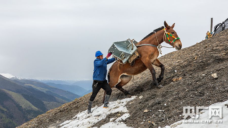 騾馬在海拔4000米的地方負重能力大幅下降,小伙子正幫助騾馬推一把力(央廣網發 通訊員供圖)
