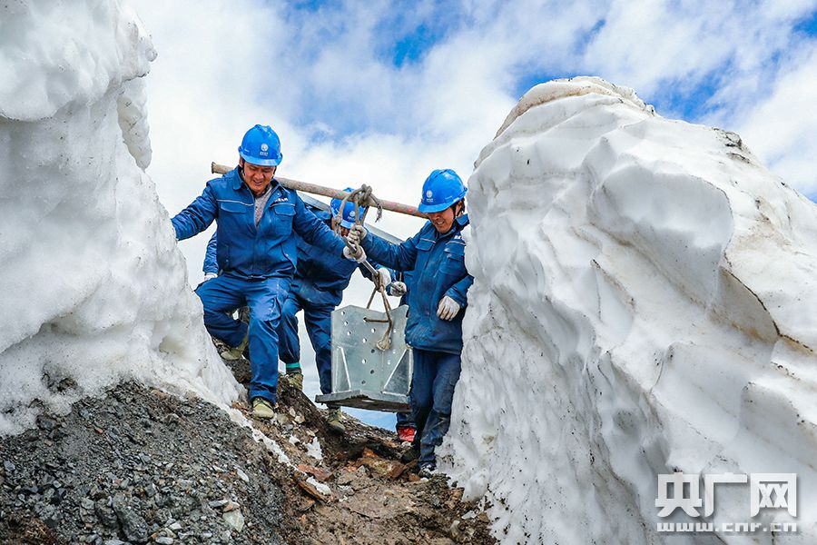 6月10日,建設者靠人力抬起沉重的塔材艱難穿過高達2米的雪墻(央廣網發 通訊員供圖)