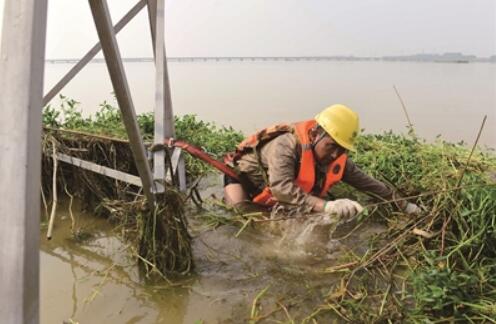 7日,淮河入江水道金湖段,電力工人正清除鐵塔周邊雜物。梁德斌攝