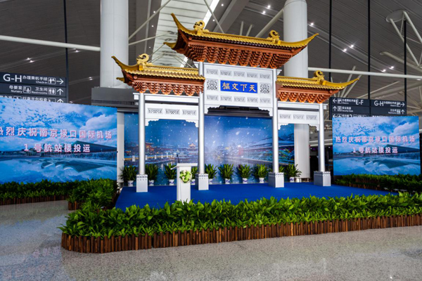 新形象:盛裝歸來 擁抱八方來客 回歸的T1航站樓,明亮通透。4組辦票島、80個值機柜臺、33條安檢通道有序分布。30臺自助值機設備、10臺自助行李托運設備、9臺安檢自助驗證的智能設備、4個支持人臉識別的自助登機閘機,值機、行李托運、安檢驗證、登機,旅客全流程自助出行。 智慧元素在T1隨處可見,洗手間外液晶屏上實時顯示廁位數量和位置、溫度濕度、空氣質量。登機口附近設有舒適的充電吧臺,無線充電設備,只需輕輕一放,自動充電。 位于出發大廳中心位置的“天下文樞”牌坊,將現代簡約結構和傳統經典形象完美融合,體現了南京夫子廟牌樓“天下文樞”精髓,牌樓頂部采用現代材料線框式焊接,通過藝術化加工達到古今碰撞虛實融合的效果。 牌坊下,通過多媒體系統,旅客可以與夫子廟、朝天宮、閱江樓等南京著名歷史文化景點親密互動。當旅客走進候機廳,波瀾壯闊的寫意山水畫,白墻黑瓦的裝飾造型,地面彩色的秦淮河水漣漪,處處闡述著豐富的江南人文內涵,為南來北往的旅客,打開了一扇扇水韻江南的文化之窗,充分展現出南京古都的豐厚底蘊。