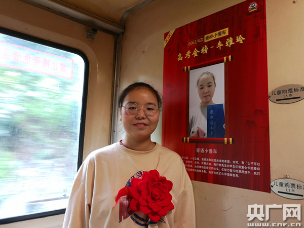 公益慢火車的乘客車雅玲如愿考上大學(央廣網發 通訊員張雁南 攝) “孩子們,今年我們小慢車的通學學生里,有7人考上了大學,現在讓我們揭開‘高考金榜’,一起來看看他們都是誰。”列車從馬蹄灣站開車后,6063次列車長向寶林一邊說著一邊揮手掀開了紅綢,只見一張紅紙金字的“高考金榜”展現在所有人眼前,上面7名“準大學生”拿著錄取通知書喜笑顏開的照片吸引了所有人的注意。 “封清杰考上西安工業大學,高璇考上了西安外國語大學,梁欣瑤被西安醫學院錄取……”向寶林車長念著榜單,受邀來到車上的5名“準大學生”依次走上前,列車工作人員為他們佩戴上大紅花,“通學車廂”還為他們準備了鋼筆、筆記本等學習用品作為禮物。最讓孩子們暖心的是,列車工作人員發現他們全都考上了西安的院校,便特意為他們辦了西安的“長安通”乘車卡,初到西安,孩子們坐地鐵、公交就一下子方便了很多。最后,封清杰、車雅玲作為代表,還對車廂內的學弟學妹們講述了高考心得、傳授了學習經驗,并送上了自己對弟弟妹妹們最美好的祝愿。