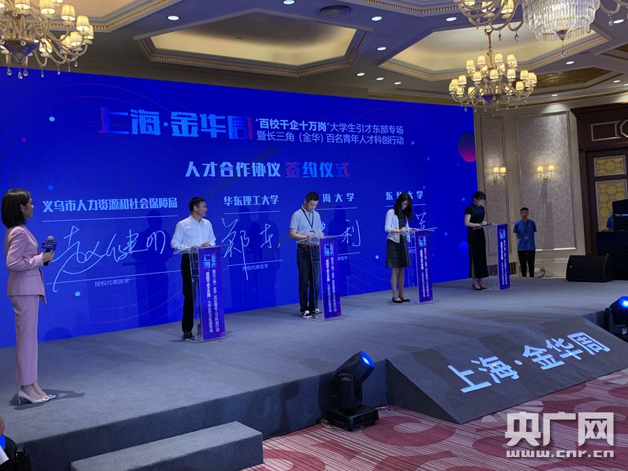 活動簽約現場(央廣網記者 張國亮 攝) 據介紹,“百校千企十萬崗”大學生引才東部專場暨長三角(金華)百名青年人才科創行動旨在進一步深化上海、金華兩地交流合作,提升開放協同創新能力,推進金華全方位融入長三角一體化發展。除了城市推介,活動還邀請了50家金華市重點企業、30所長三角地區重點高校和10家國內人力資源龍頭企業參加此次活動。 “義烏是一座愛才惜才,沒有圍墻的開放包容之城。我們有正在建設的雙江湖高校產業園區,有高含金量的人政策,有‘揭榜掛帥’的柔性引才機制,有高能級的產業平臺!被顒蝇F場,金華義烏市委組織部長何若偉也向全球人才發出了誠摯的邀約,分享了大學生在義烏創業的生動故事。 近年來,義烏在全國率先出臺采購商人才政策,打破學歷、資歷和職稱限制,評選了首批64名金牌、銀牌采購商人才,并配套人才住房、子女入學、出入境、倉儲物流、金融支持等“一攬子”政策。出臺重點領域人才專項政策,實施百名優秀教師引進計劃、千名一線教師進修計劃、千名骨干教師培養計劃、衛生領域高層次人才引進計劃等。成立義烏市人才發展集團,打造雙江湖科教園區、院士之家、人才創業園、產業工程師協同創新中心等高能級平臺,不斷做大人才“蓄水池”。以人才“一張床”改革為牽引,構建“一周免費住、三年半價租、購房直接補”人才住房體系。今年1-8月,新增首次來義大學生2.5萬名,同比增長50%以上。 活動現場,金華、義烏兩地與上海楊浦區及部分高校簽訂人才合作協議。據悉,此次活動是“2020上海-金華周”系列引才活動之一!2020上海-金華周”以“接軌上海·創贏未來”為主題,重點在人才科技對接、重大項目引進、金華文化旅游推介及長三角內陸城市合作交流等方面謀求新突破新成效。“2020上海-金華周”期間,除此次活動外,還將舉辦長三角G60金華(上海)科創中心和人才大廈揭牌、長三角內陸開放聯動發展論壇等活動。 |