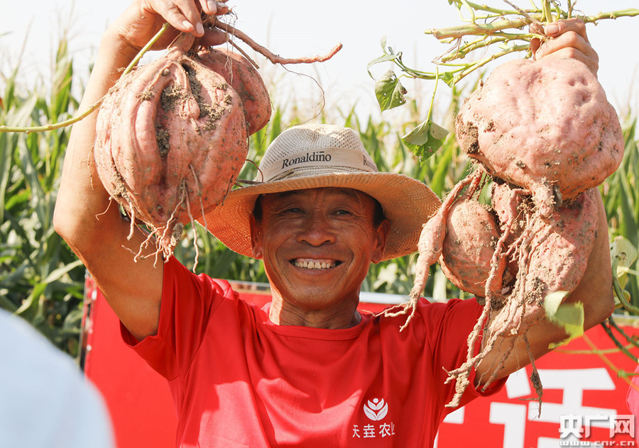 9月20日,在天津市武清區豆張莊鎮周立營村田野里,一場“歡慶豐收 助力鄉村振興”為主題的慶祝農民豐收節活動正在舉行,村民手舉著剛剛從地里挖出的煙薯(央廣網記者 劉陽 攝)