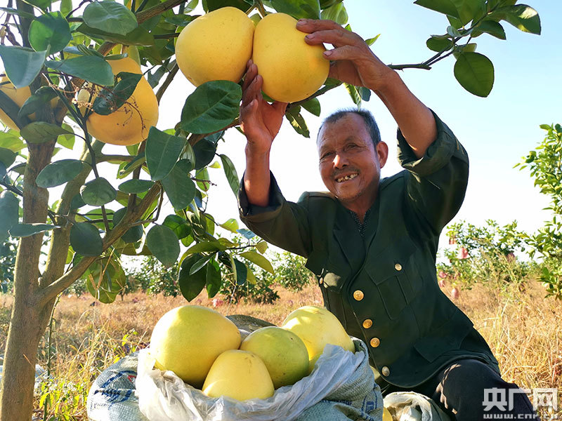 村民喜采豐收柚(央廣網發 通訊員殷姿 攝) “剛摘下的五千斤紅心柚一上市就被訂購出去了,今年柚子大豐收,一定有個好收成!苯洗逦瘯魅涡ぶ樘m一邊指揮村民采摘打包柚子一邊笑呵呵地說道。
