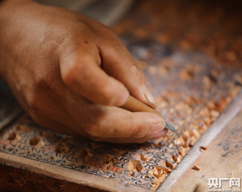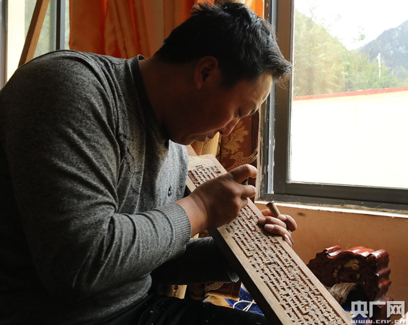 村民白瑪堅參正在雕刻(中央廣播電視總臺央廣記者 普布次仁 攝) 白瑪堅參說:“因為沒上過學,以前也沒想過能去干點什么。后來,學到木雕技術后,一個月基本能刻出6個木刻板,一個刻板能賣到650元到850元不等的價格,收入很不錯!