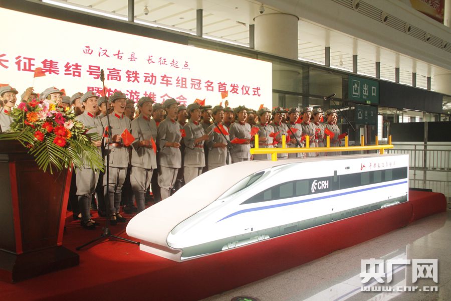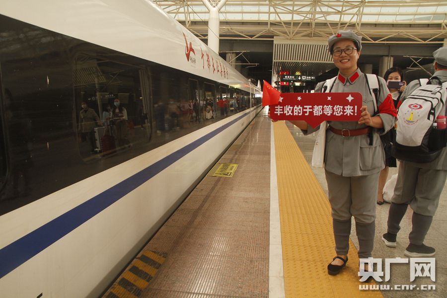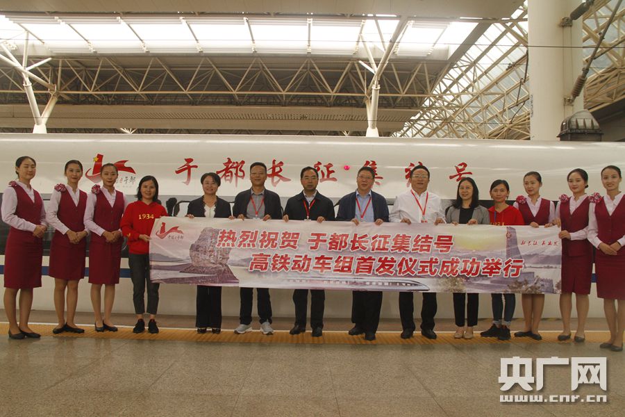 “于都長征集結號”冠名動車組首發 (央廣網發 通訊員供圖) 據悉,該列車由中央紅軍長征集結出發地江西于都冠名,運行時間為一年,共1列車次8節車廂。投放形式包括車身彩貼、展牌、小桌板、列車廣播等多種媒體形式的組合,旨在打造一張馳騁于昌吉贛高鐵線上的“流動名片”,全方位展示于都文化旅游品牌形象。于都縣文廣新旅局局長謝蕓華說,昌吉贛高鐵的開通運行,于都到南昌由原先乘坐列車的五個多小時縮短到兩個小時。縮短兩地時間距離的同時,也直接拉近了贛南原中央蘇區與長三角、珠三角、閩東南經濟帶距離,將更好地助力于都的振興發展。