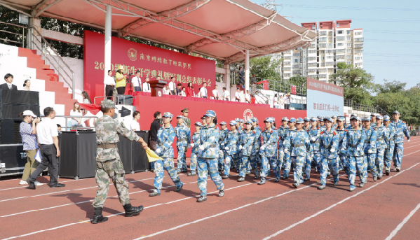 據了解,今年南京特師將愛國教育、國防教育、校情校史教育、校園文化教育、博愛教育、中華傳統文化教育進行了整合和創新,繼續在全體新生中推廣手語版國歌。開學典禮現場還開展了佩戴;、中秋禮傳承儀式等。全體新生以飽滿的精神、昂揚的姿態完成了軍訓檢閱和開學典禮。