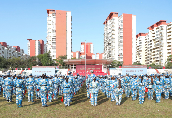 軍訓團29個連隊的九個受閱方陣,在軍訓團團旗的引領下,步伐整齊,口號嘹亮,以昂揚的姿態,振奮的精神逐一走過主席臺,接受檢閱。匯報表演中,學生匕首操、軍體拳表演鏗鏘有力、凌厲有度,充分展示了軍訓取得的成果,展現了莘莘學子積極向上的精神風采。