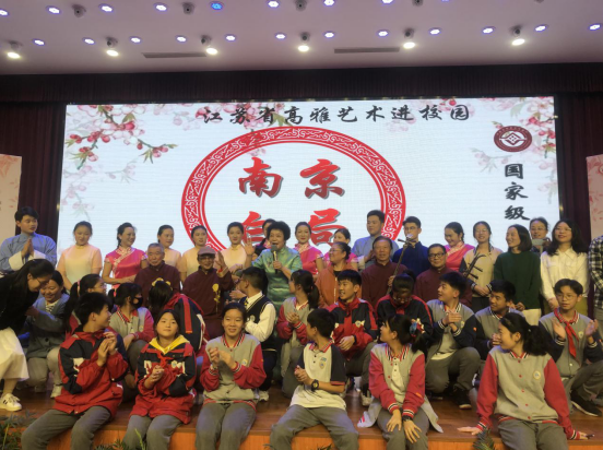 黃玲玲老師與小戲迷們合影留念 南京白局進校園活動不僅提高了師生們的藝術修養和文化素質,還讓大家深深地感受到了來自傳統文化的魅力,并且向年輕一代的孩子們普及了白局這項藝術形式,對保護和傳承南京白局有著重要意義。(戚軒瑜 徐新萌) |
