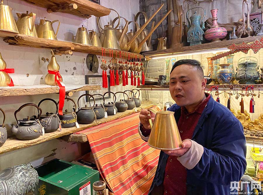李陽陽展示自己制作的銅壺(央廣網記者 鄭皓月 攝) 除此之外,貧困戶還可以到袁家村的商戶進行就業,讓貧困戶有合適的崗位,有固定收入,實現穩步脫貧。煙霞鎮西屯村的高勉良妻子患有小兒麻痹,沒辦法干重活,袁家村為高勉良提供了工作崗位。2017年在政府的幫助下蓋了房子,過上了好日子。