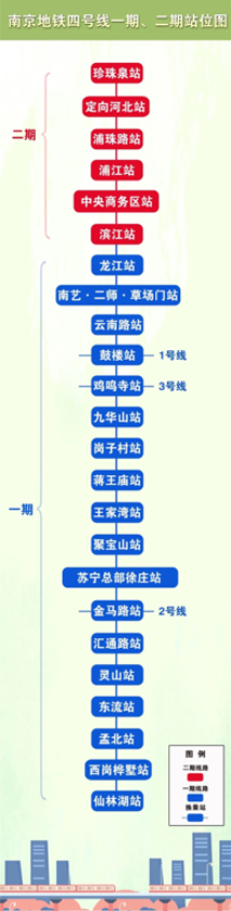 在站點設置上,4號線二期工程起于一期工程龍江站,向西下穿長江夾江、江心洲、潛洲和長江干線后,沿定山大街、浦烏路敷設,止于珍珠泉站,線路全長約10公里,沿線行經鼓樓區、建鄴區(江心洲)和江北新區,共設車站6座,均為地下站,分別為珍珠泉站、定向河北站、浦珠路站、浦江站、中央商務區站和濱江站。