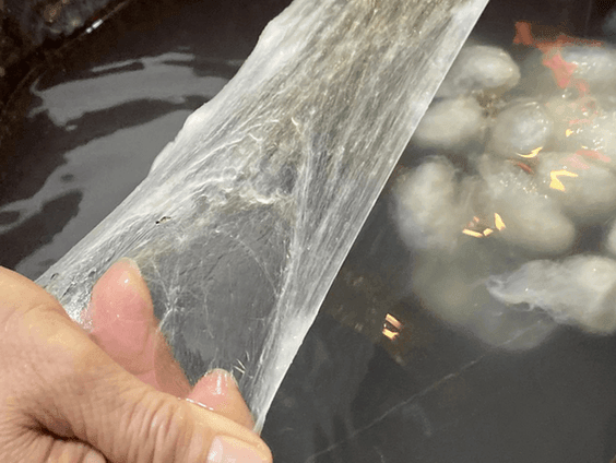 進博會江蘇館(席航飛 攝) 在山水絲綢展臺,年過六旬的老手藝人姚來英正在展示“剝綿兜”的傳統工藝,將潔白如雪的蠶繭泡水、開剝,拉扯成薄如蠶翼的繭絲,層層套在模具上,姚來英行云流水般的制作手法,贏得了圍觀人群的陣陣叫好。這個“抽絲剝繭”的過程,是世界非物質文化遺產蠶桑絲織技藝中重要的環節。剝好的“綿兜”正是蠶絲被,蠶絲棉襖的原材料。