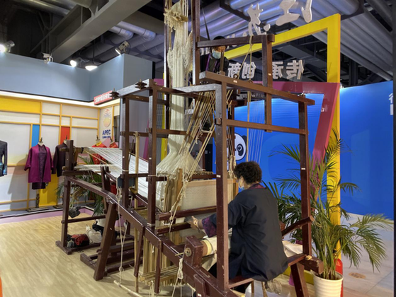 傳統手工藝“剝綿兜”(席航飛 攝) “‘剝綿兜’必須要以手工來完成,這樣制成的蠶絲被又輕又暖。目前我們從事這項工藝的工匠,年齡最大的已經有70多歲,我們也想通過這次展覽,讓更多的人了解到我們的傳統手工藝和老字號,傳承這項珍貴的技藝。”該展臺的一位工作人員介紹說。 在江蘇館展區的另一邊,一架綁著大量絲線的木質機器,讓大家仿佛穿越時空,回到了紡織作坊剛剛興盛的年代。這架有著上千年歷史的織機,正在展示世界非物質文化遺產——宋錦織造技藝。