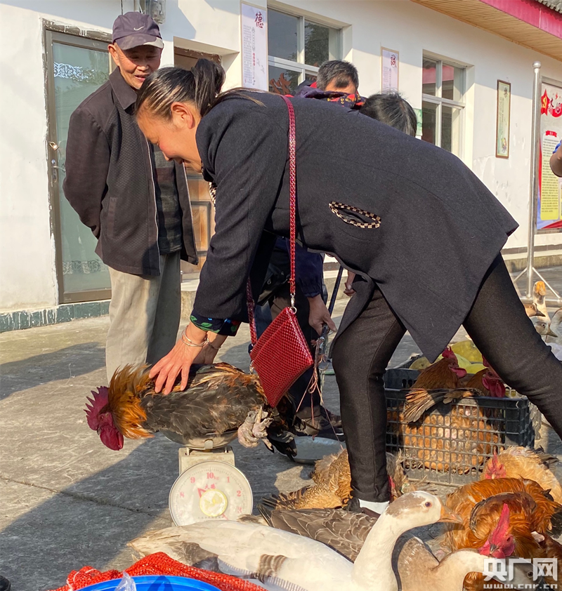 青松村扶貧趕集日(央廣網記者 王穎 攝) 央廣網綿陽11月8日消息(記者王穎)在四川綿陽安州區秀水鎮青松村每月的“扶貧趕集日”上,村委會的大院里一派熱鬧的景象。村民們帶著自家種植養殖的農作物和家禽來趕集,大院里地上各自成攤,打圈擺著五谷、各類蔬菜、家禽和活魚,村民們說笑聊天,雞鴨鵝唱起“和聲”。院子里不時的走進購物的人群,這些人購物有個特點,一次購買量都比較大。不到一個小時的時間里,多位村民攤位上的農副產品就銷售一空。青松村第一書記羅歡說,“像這樣一次趕集,一戶村民家的家禽起碼可以給他們帶來六七百元的收入,蔬菜能夠帶來兩三百的收入。”這個扶貧趕集日深得村民的喜歡,每到趕集日村里有一種過節般的喜悅和熱鬧的氣氛。