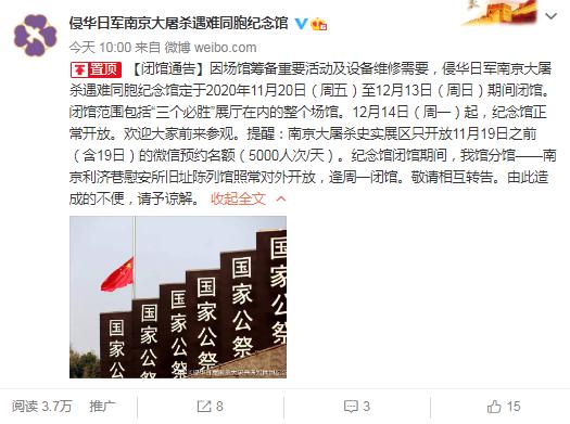 據侵華日軍南京大屠殺遇難同胞紀念館官方微博消息,因場館籌備重要活動及設備維修需要,定于11月20日至12月13日期間閉館。閉館范圍包括“三個必勝”展廳在內的整個場館。12月14日起,紀念館將正常對外開放。(楊升輝 徐紅霞)