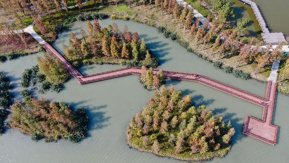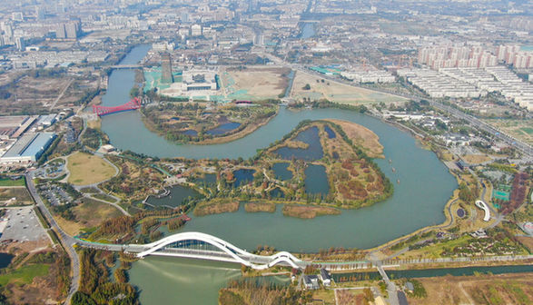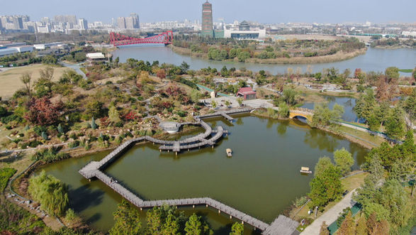 這是11月14日拍攝的運河三灣生態文化公園景色(無人機照片)。 水蘊:江河交匯,綠色新生 位于揚州的江都水利樞紐,一塊刻有“源頭”字樣的石碑靜靜矗立。每年,有150億立方米左右的長江水從這里輸出,潤蘇北、濟齊魯,最終送至千里之外的華北地區。 南水北調,成敗在水質!霸搭^”二字,責任重大。 治水的辦法在“岸上”。作為長江和運河的交匯城市,2013年以來,揚州沿南水北調東線輸水廊道規劃建設了1800平方公里的生態走廊,將沿江岸線的82.4%劃為岸線保護區和控制利用區;把沿江縱深一公里范圍內3.86萬畝土地列入限制和禁止建設區;推動沿江化工產業退后一公里,關;て髽I263家;將唯一的化工園區產業規劃面積從22.6平方公里壓減至9.3平方公里……實現了水源地生態保護從“一條線”到涵養“一大片”。去年4月,南水北調源頭公園正式開放。