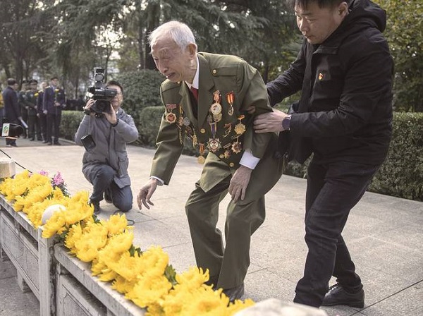 11月29日,是中國人民志愿軍特等功臣、特級戰斗英雄楊根思烈士犧牲70周年紀念日。泰興市楊根思烈士陵園,天地靜默,松柏肅穆。 “老連長,我來看您了!睏罡剂沂恳鹿谮G,90歲高齡的楊德盛手捧鮮花,熱淚盈眶,言語哽咽。70年前,楊根思作為志愿軍第20軍58師172團3連連長,奔赴抗美援朝戰場。老家泰縣的楊德盛,是楊根思生前老戰友,這是他第九次來看“老連長”。楊德盛清楚地記得,解放上海時,他與楊根思相識,被楊根思稱作“小老鄉”。至今,老人依然記得老連長留給他的最后一句話“別給我丟臉,別當孬種。 “老連長犧牲時,我離他只有100多米,遠遠地就看到了火光!闭驹诹沂苛陥@廣場,老人又一次回憶起當時的情景:1950年11月29日,當敵人向陣地發起第九次進攻時,楊根思命令通訊員把重傷員背下陣地,又命令機槍手把打光子彈的重機槍撤下陣地,自己孤身一人留下堅持戰斗。打出最后一顆子彈后,他埋伏在高地上,當美國兵快到山頂時,他抱起一個炸藥包,拉響導火索,沖向敵群,與40多個敵人同歸于盡。 老連長生前的照顧和囑托,令楊德盛此生難忘。這次老人和兒子楊根寶一起從成都回到泰州,將珍藏的從朝鮮戰場繳獲的美制迫擊炮照明彈和炸藥桶捐給楊根思烈士陵園。楊根寶說,為了緬懷老連長,父親特意給他取名“楊根寶”,巧的是他的生日就是11月29日。迫擊炮照明彈和炸藥桶一直被父親珍藏在家中,與軍功章、軍服等放在一起,從不準他觸碰!艾F在把它們放在泰興,是為了教育后代,讓他們不忘記歷史。”楊德盛說。(趙曉勇 張建榮 趙留鋒 程 鵬 顧繼紅 張建榮) |