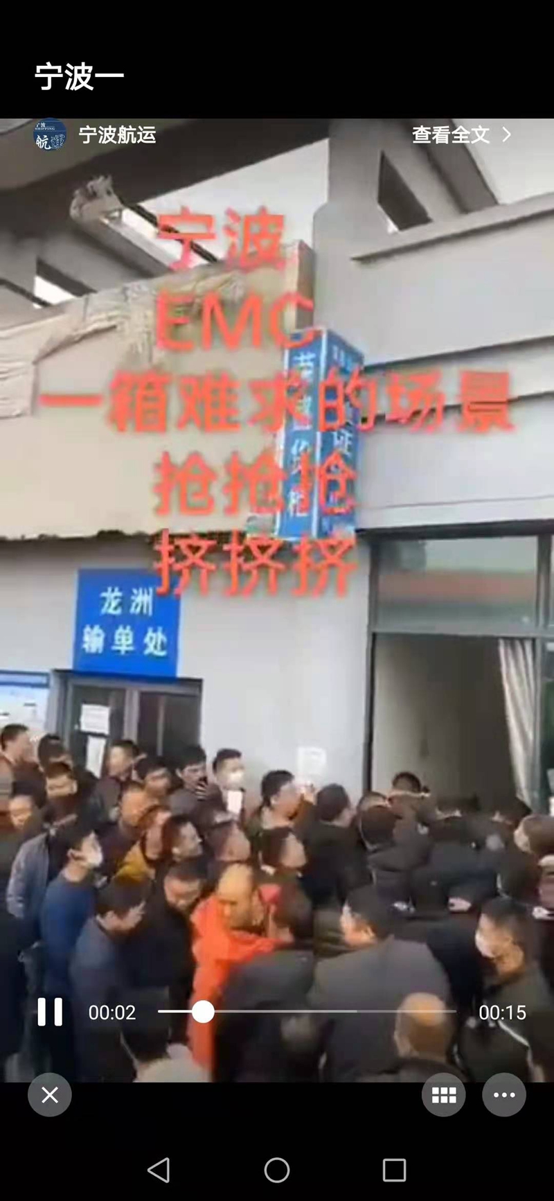 集裝箱司機搶箱視頻截屏 央廣網寧波12月9日消息(記者曹美麗)這兩天,寧波外貿人的朋友圈被一則司機搶箱視頻刷屏。視頻中,集卡車司機為了提一個集裝箱,在打單窗口擠成一團。沒錯,集裝箱“一箱難求”的現象,正讓寧波眾多外貿企業頗為煩惱。 “現在確實是空箱難求。從9月份開始,到現在越來越嚴重了!睂幉ㄊ薪煌ㄟ\輸協會集卡分會會長周海東告訴記者,由于疫情影響,大量的集裝箱滯留在國外港口,有的甚至在船上無法卸貨,導致從中國出去的箱子,大約每3個箱子只能回來1個。