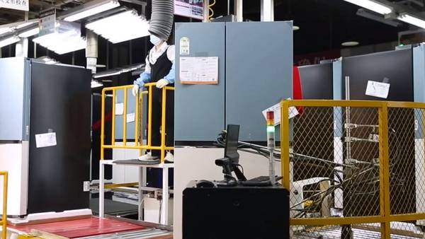 在樂金電子冰箱生產四號線車間內,機械設備轟鳴聲不斷,在整條生產線上,冰箱的預裝、發泡、組裝、質檢、包裝等工作都在有條不紊地進行。據了解,這條生產線的產品是該企業新研發的雙開門冰箱,擁有球形制冰機,保溫效果更顯著,外觀設計也更符合用戶的審美標準。車間采用了型合機、Lead wire機器人、自動導軌、箱體發泡機等多種智能化設備,提升了生產效率和管理水平,去年該車間也創成省級智能制造示范車間。對于該車間的智能化程度和生產效率,車間經理陳飛介紹說:“我們這條生產線平均日產2000~2200臺冰箱,車間的智能化設備差不多是95個,聯網率達到了98%以上,接下來我們車間的智能化率將會持續提高。”